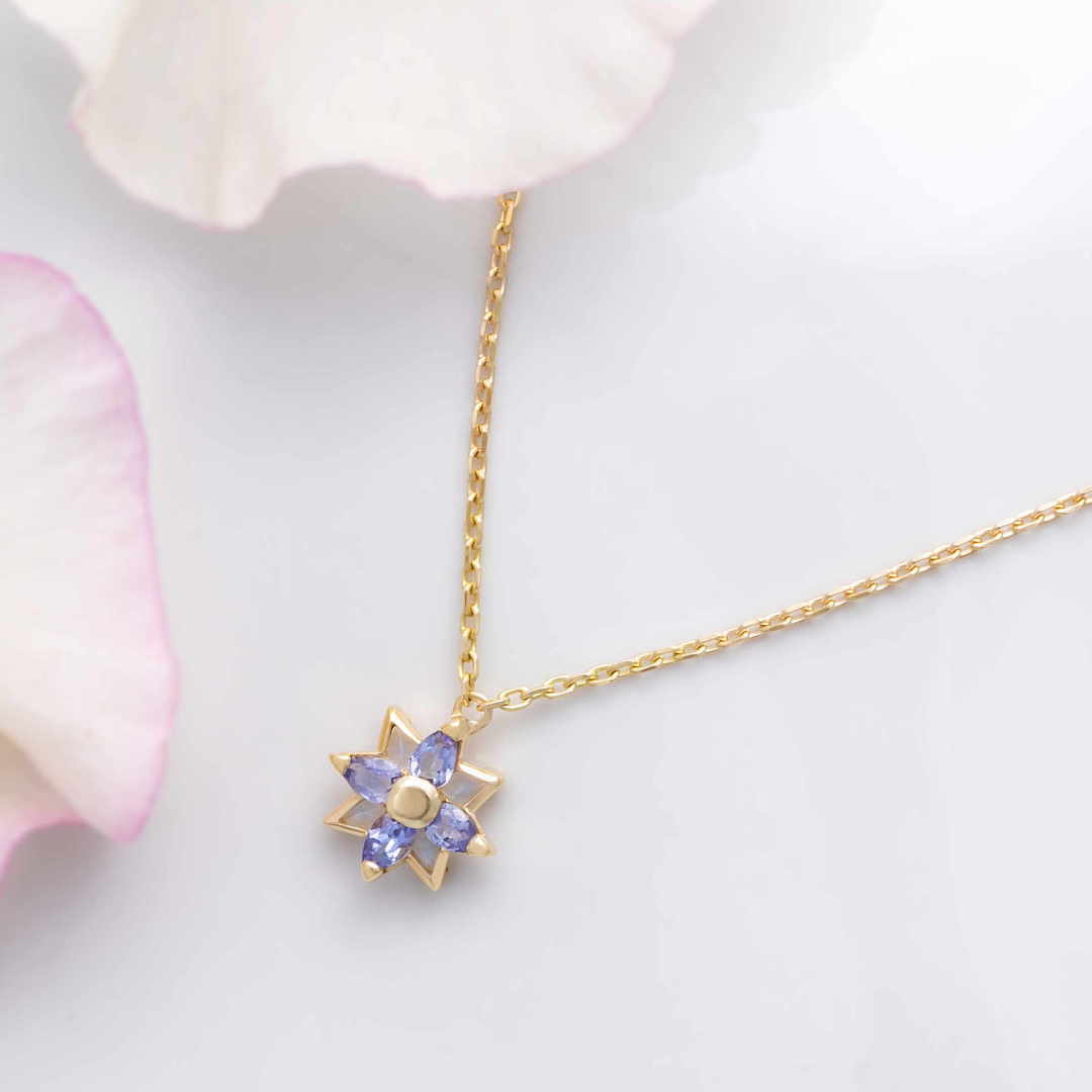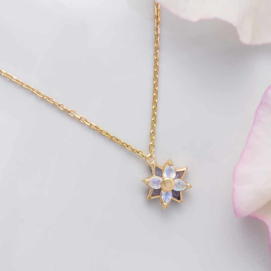 反対面のタンザナイトやロイヤルブルームーンストーンが、光を受けてステンドグラスのように透けるのも、このネックレスならではの魅力です。