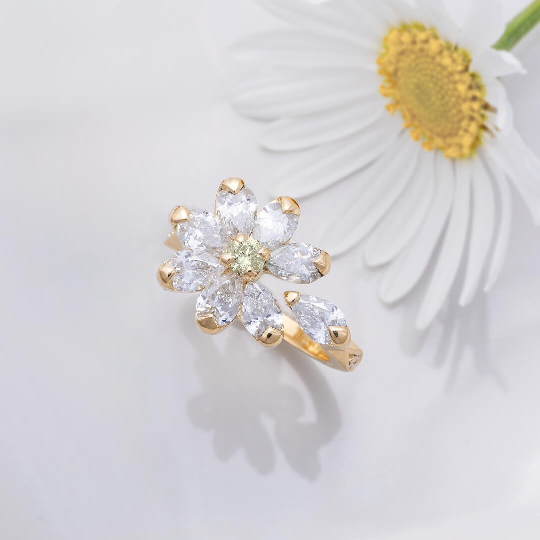 そんなマーガレットをモチーフに花占いにちなんで、花弁を1枚散らしたデザインの大人のためのフラワーリング(指輪)です。