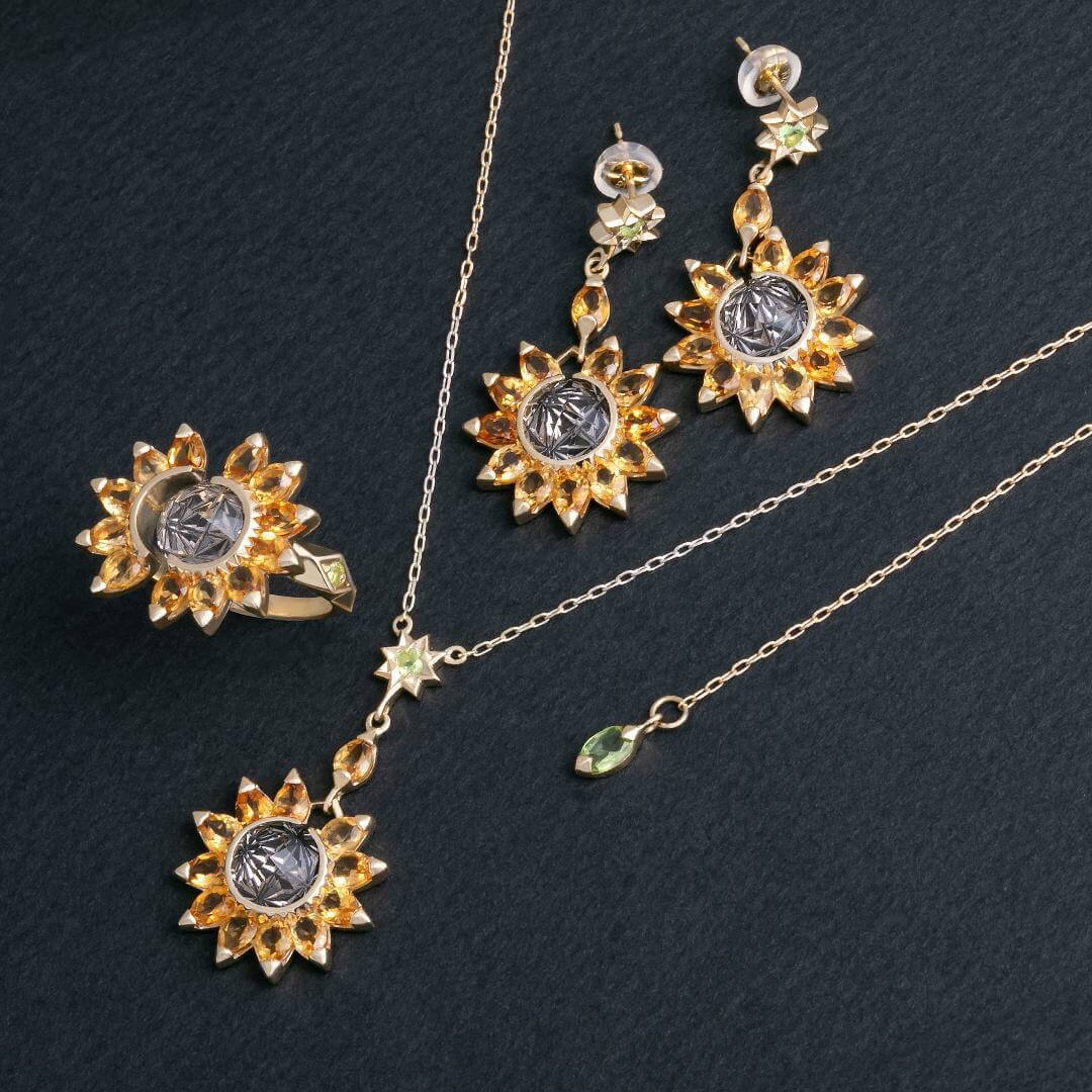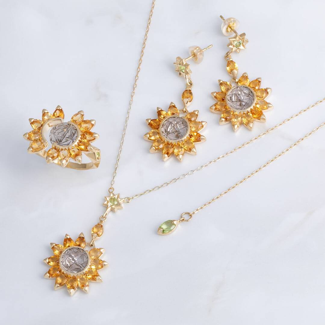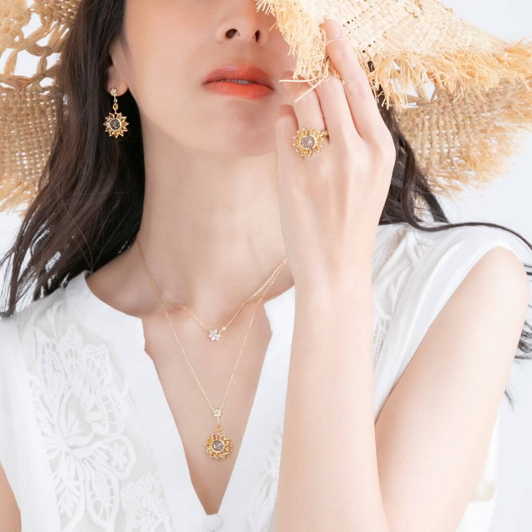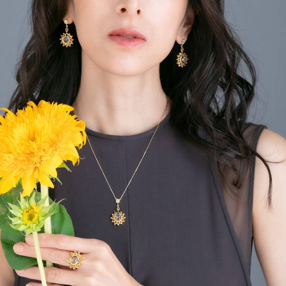 手元で太陽のように煌めき、生き生きとした中に、どこか儚さもある、大人の女性ためのデザインです。