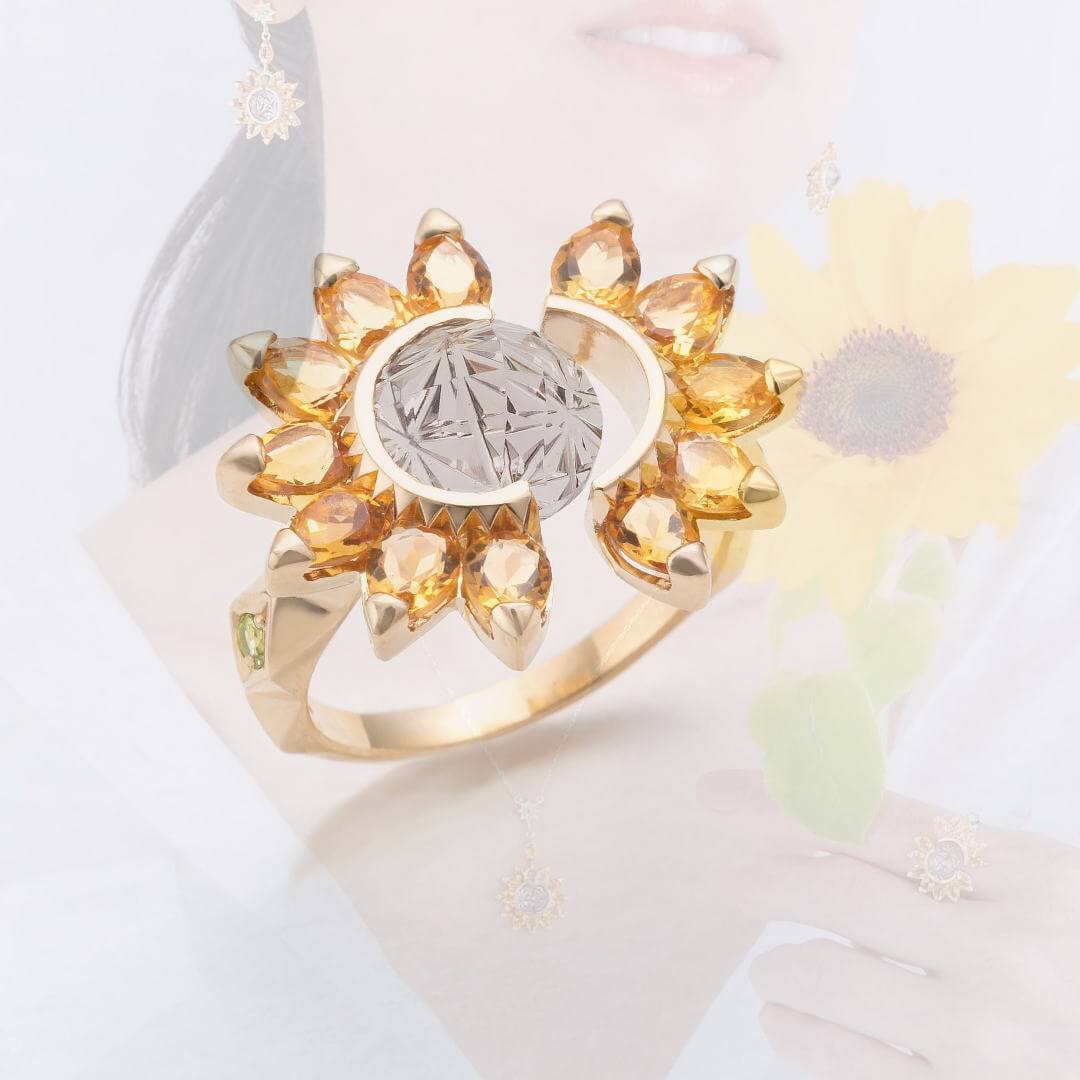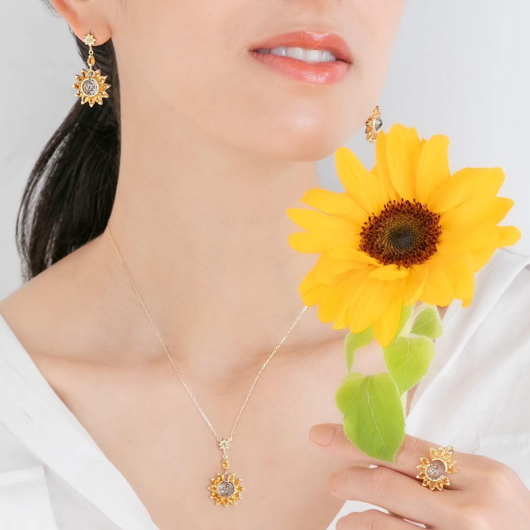 8月誕生花の1つのひまわりのモチーフリングのサイド部分には、若葉のような明るい緑の輝きの8月誕生石ペリドットをあしらい、着用していると正面は勿論、時折覗く側面も抜け目のないデザインに仕上げました。