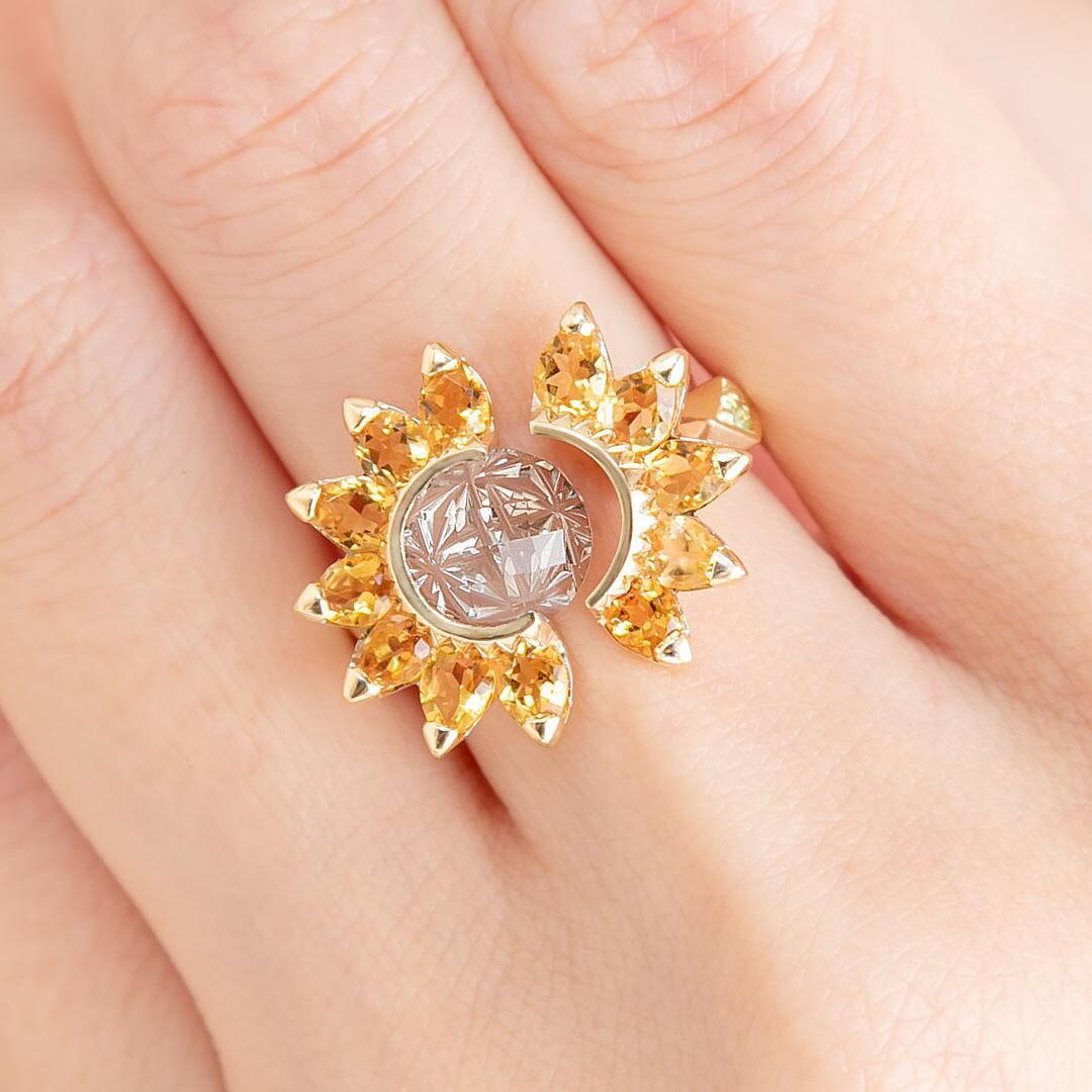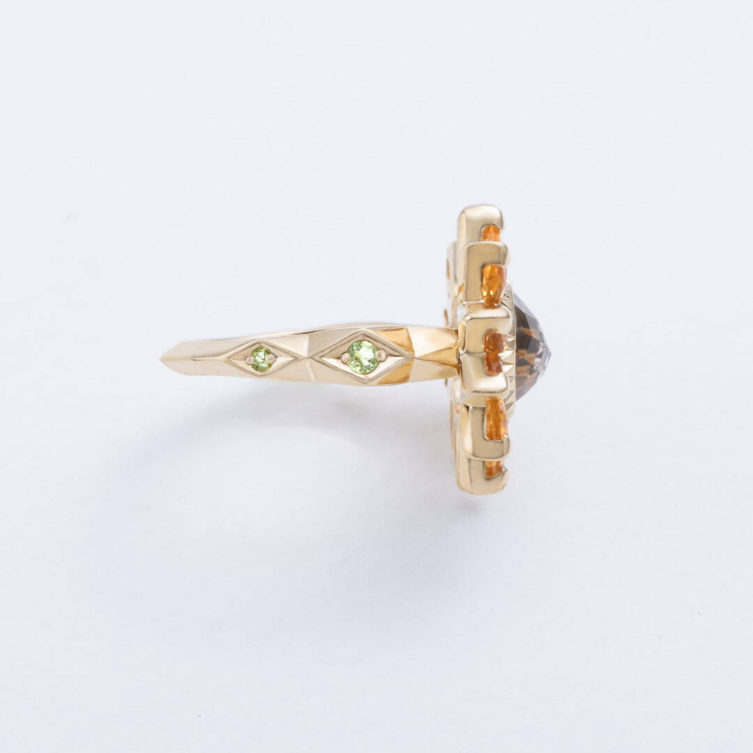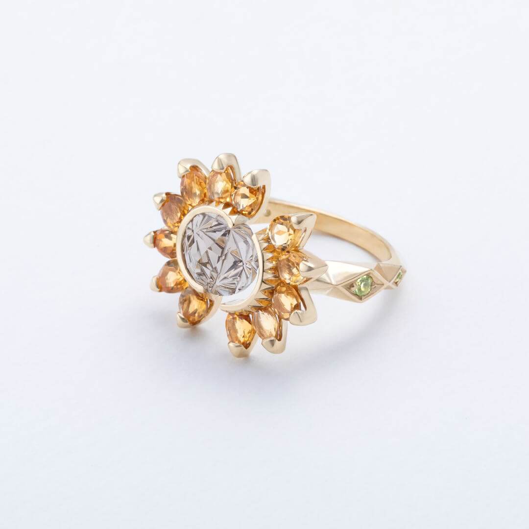 宝石に切子細工を施した甲州貴石切子のスモーキークォーツの輝きに目を奪われるひまわりリング。